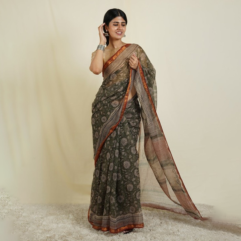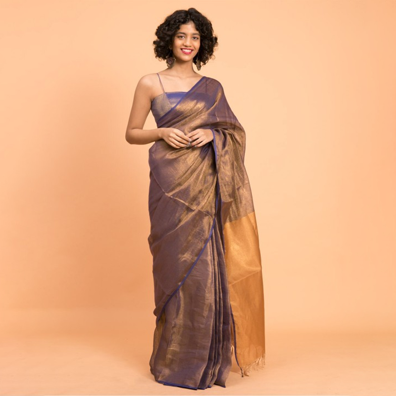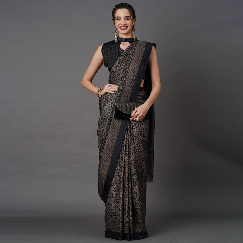 Black & Grey Ethnic Motifs Zari Pure Linen Saree